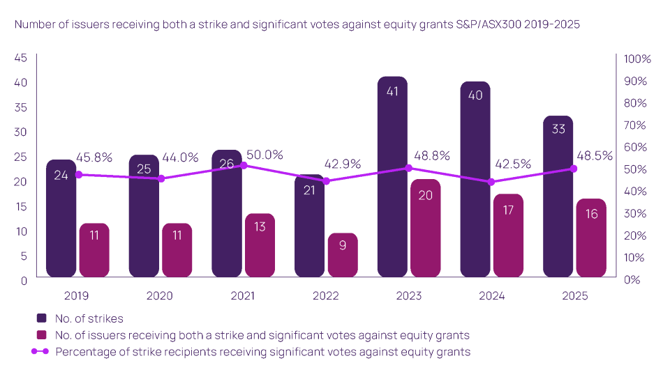 Interestingly, of the 33 companies across the S&P/ASX300 that received a strike in 2025, nearly half (16 issuers, or 48.5%) also faced significant opposition (10% or more votes against) to their forward-looking equity grant proposals. On average since 2019, 46.1% of issuers that received a strike also received at least 10% of votes against their equity grants.