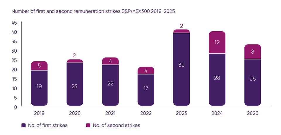 In November 2025 the Australian Securities and Investments Commission (ASIC) issued a report3 highlighting how the two-strikes rule has grown its influence and complexity since it was introduced in 2011. ASIC’s report noted that, whilst originally intended as a mechanism to give shareholders a meaningful voice on executive pay, the rule is increasingly used as a broader protest tool.